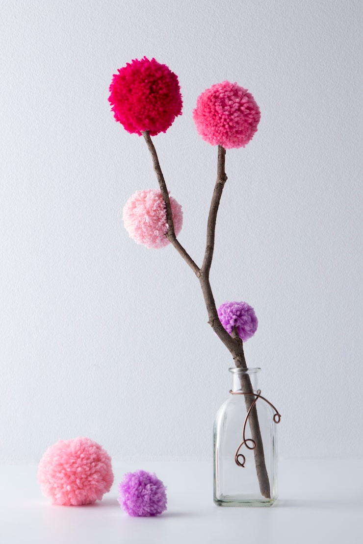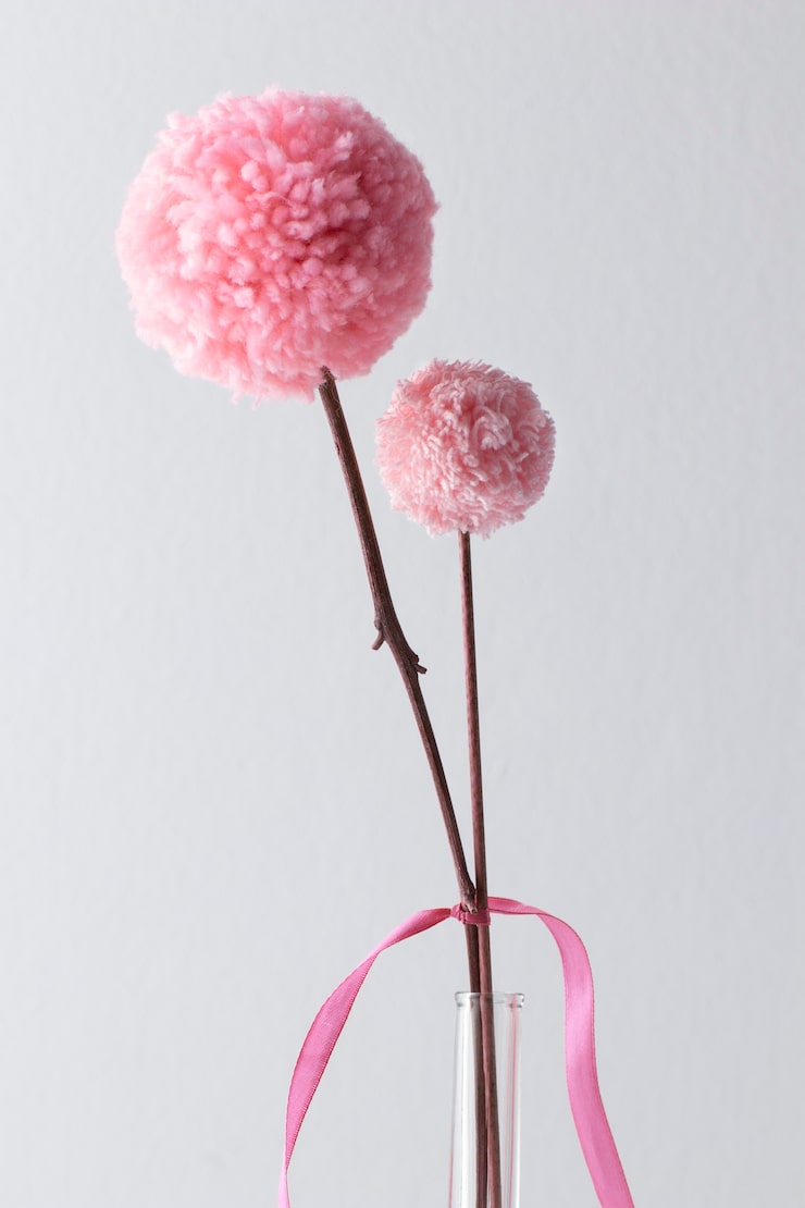 Для придания стеблям цветов желаемый вид, их окрашивают с помощью аэрозольной краски. Чтобы первоначальный цвет коры не был виден, рекомендуется нанести несколько слоев. После того, как ветки высохнут, к ним можно будет приклеивать ранее изготовленные помпоны.