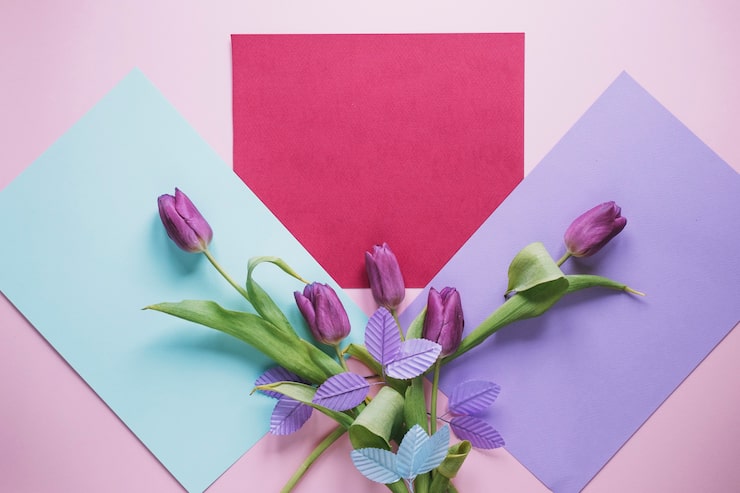 Чтобы сделать тюльпаны из бумаги, понадобятся цветная бумага, ножницы и клей.