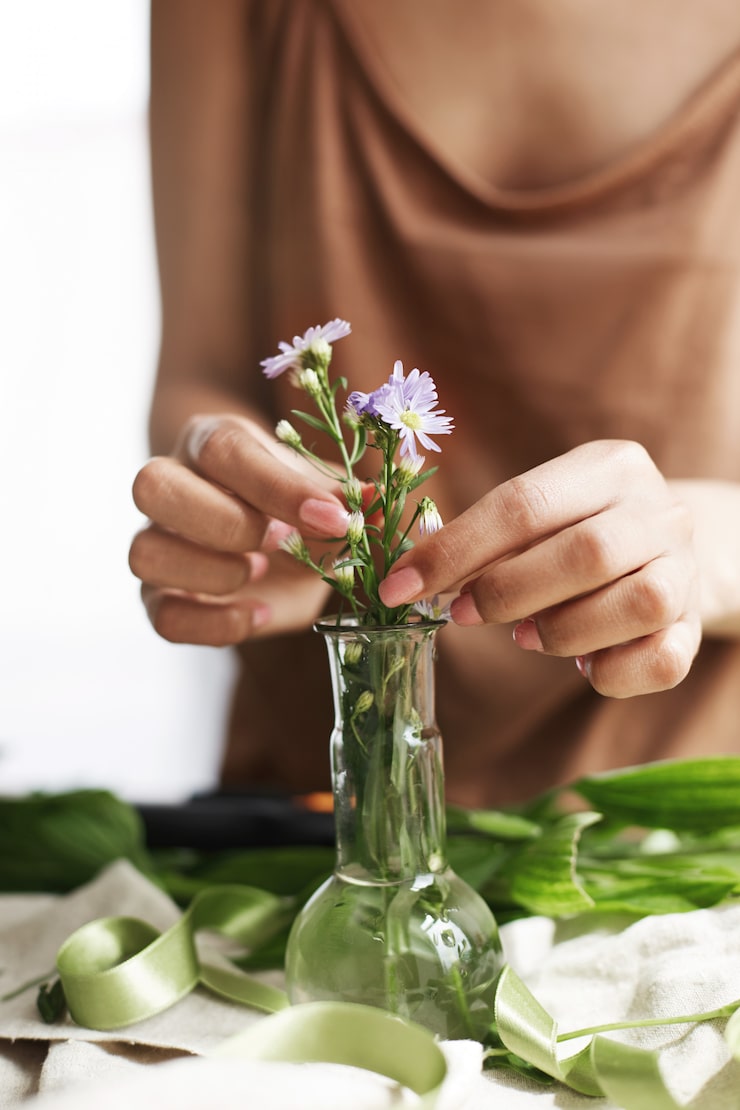 Если вы не планируете помещать в такую вазочку живой цветок, а предпочтете поставить небольшой букет срезанных цветов, то их можно расположить в стакане. В этом случае ваза из прищепок станет интересным и необычным элементом декора.