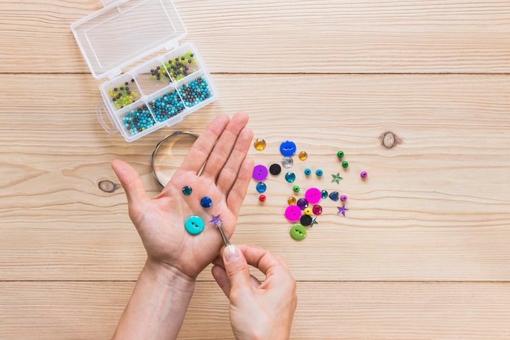 Перед началом работы необходимо подготовить рабочее место, обеспечив достаточно свободного пространства для комфортного перемещения рук и хорошее освещение. Важно, чтобы все бусины и фурнитура были легко доступны. Поскольку изготовление бижутерии – это творческий процесс, мозгу нужно пространство для работы. Для этого я обычно раскладываю бусины и бисер, которые планирую использовать для конкретного изделия, в отдельных емкостях. Можно использовать органайзер с разделителями, но мне удобнее спичечные коробки, так как их легко перемещать и создавать различные сочетания. Во время работы бисер часто выпадает из пальцев и рассыпается. Эту проблему помогает решить широкая, но неглубокая коробка, расположенная на рабочем месте. Я чаще всего использую крышку от большой обувной коробки для работы, так как бортики не позволяют бусинам рассыпаться».