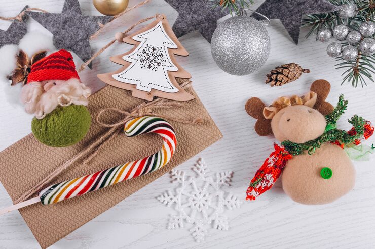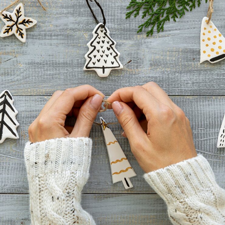 Если у вас не хватает времени на изготовление игрушек своими руками, вы можете пришить готовые украшения и декоративные элементы к елке