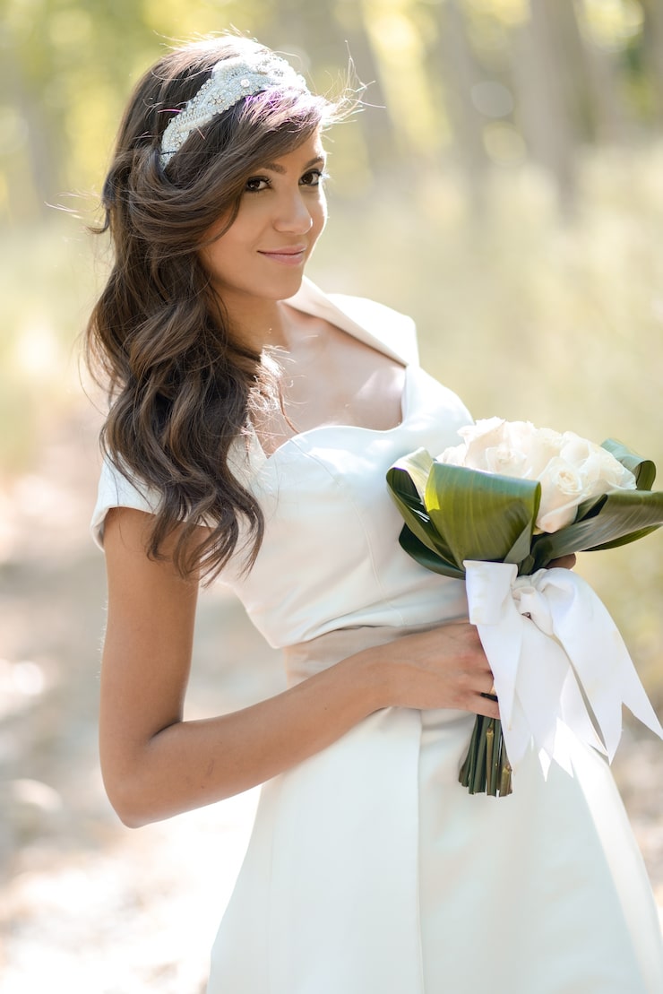 Для маскировки шва на бант наносится золотая тесьма. А для создания имитации свадебного колье на кружевной воротничок приклеивается тесьма, украшенная стразами.