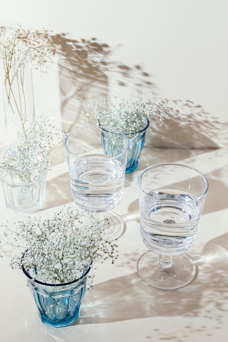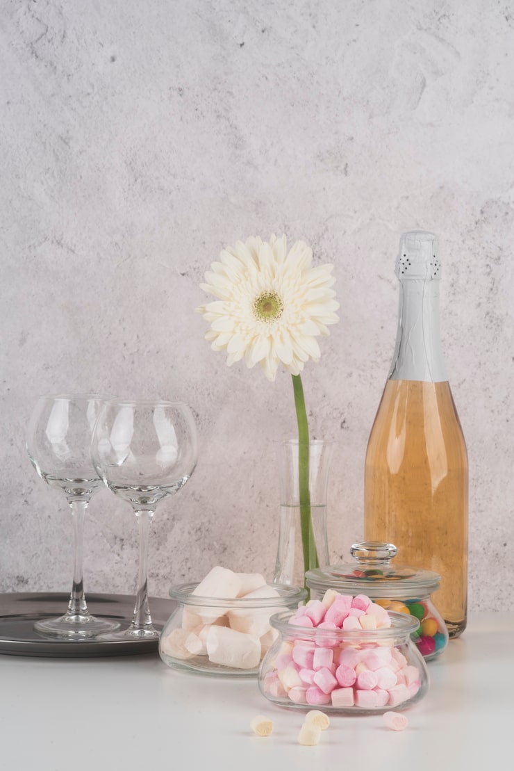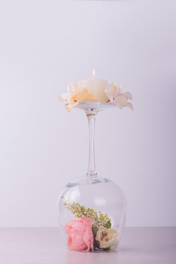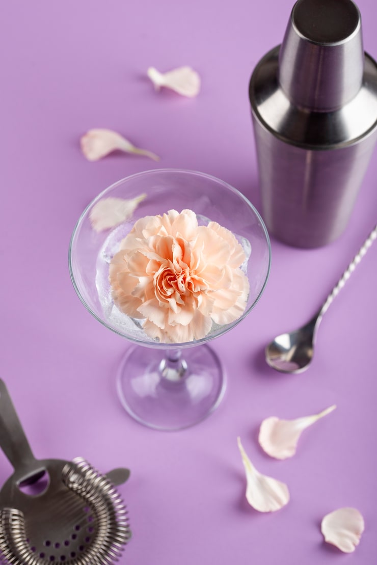 Остывшие цветы с бутонами аккуратно прикрепляются к ножкам и стенкам бокалов.