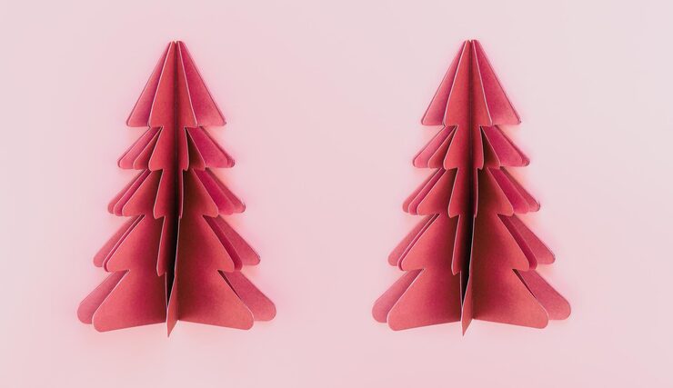 Чтобы изготовить елку, вырежьте ее из бумаги, приложите к сложенному пополам фетру и зафиксируйте швейными булавками. Это позволит вырезать две идентичные половинки будущей елки.