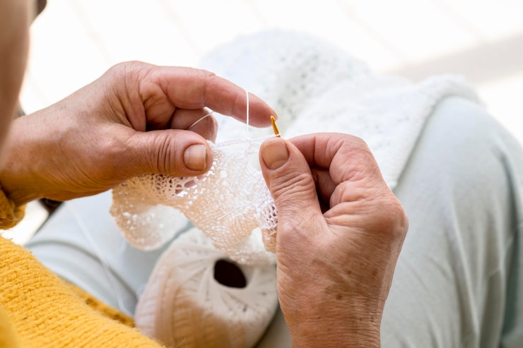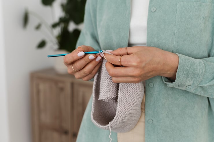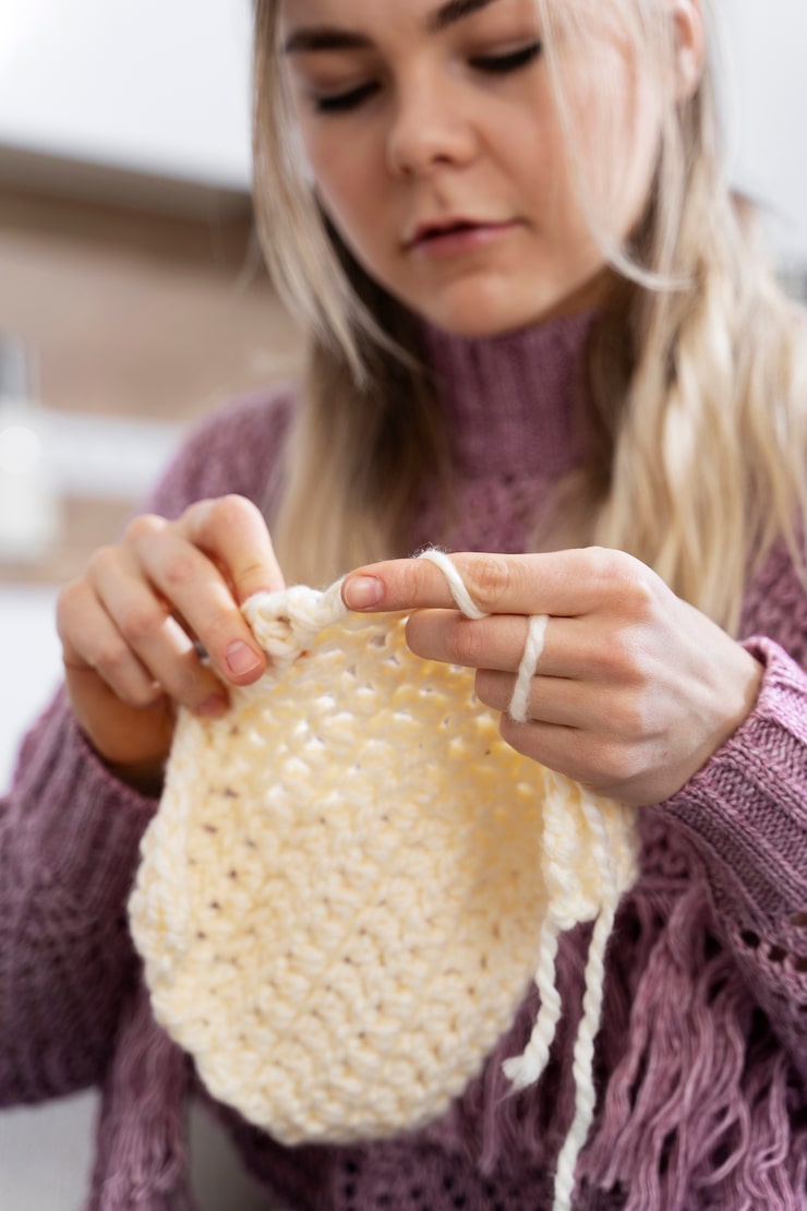 Затем подтягиваем узел и обрезаем нить, оставляя небольшой кончик. Свободные концы аккуратно затягиваем крючком под вязку.