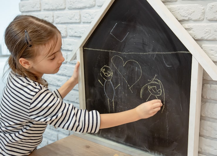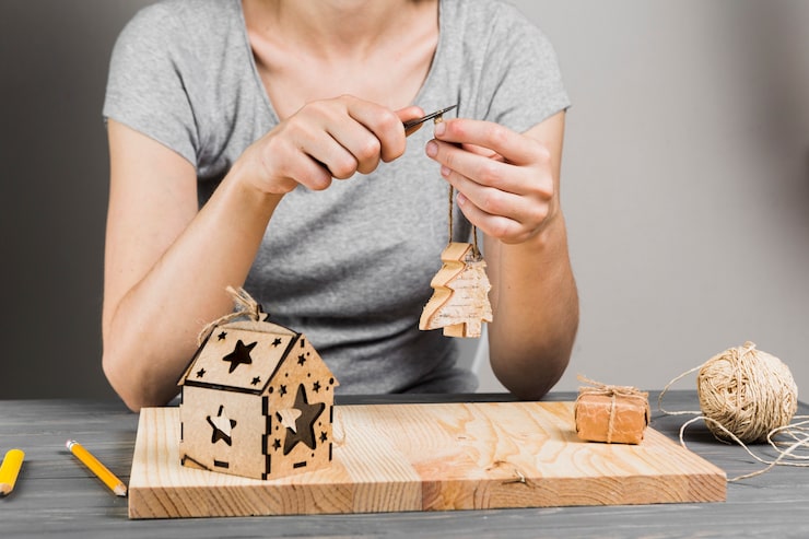 Для создания домика девочке потребуется дверная петля и небольшой фрагмент плотного картона или пластика. Дверцу прикрепляют к дверной петле, после чего её поверхности оклеиваются самоклеящейся пленкой со всех сторон.