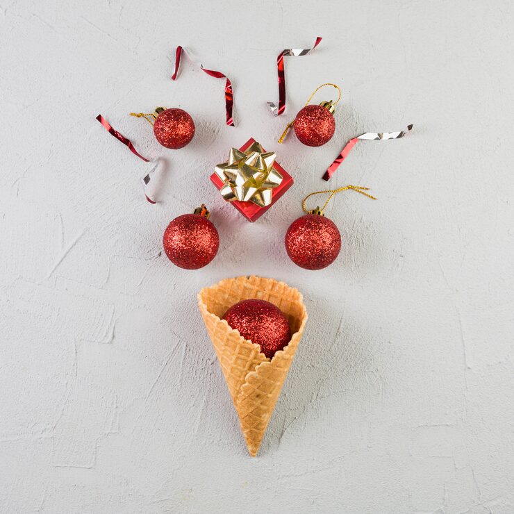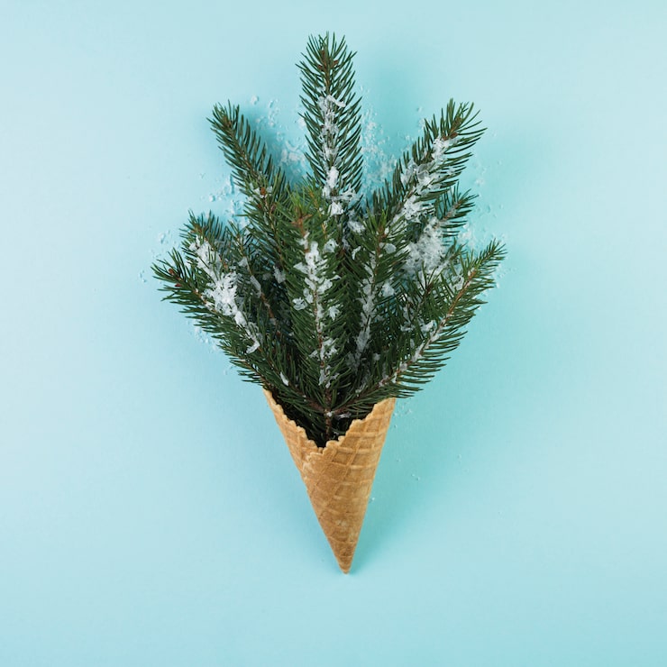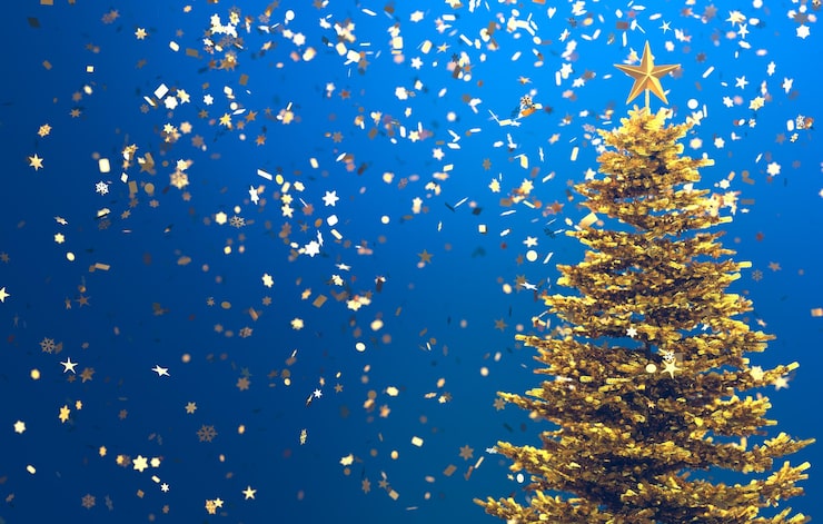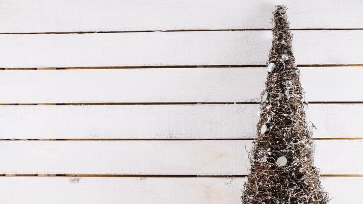 Новогоднюю ель можно окрасить в золотистый или зеленый оттенок и дополнить декоративными элементами.