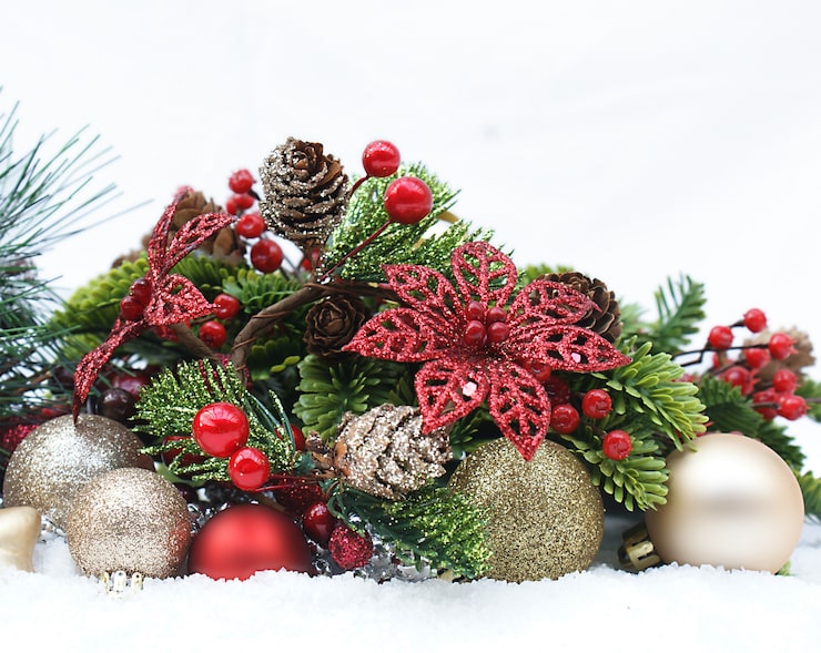 Поистине великолепные новогодние композиции можно создать с помощью разнообразных шишек. Начнем с самого простого, но не менее эффектного варианта. Шишки разного размера необходимо окрасить перламутровой краской. Рекомендуется использовать различные оттенки: золотой, серебряный, красный, синий, желтый. После этого все шишки помещаются в высокий стеклянный сосуд, который впоследствии можно использовать как декоративный элемент на столе. Сосуд, к слову, можно выбрать любой, руководствуясь личными предпочтениями.