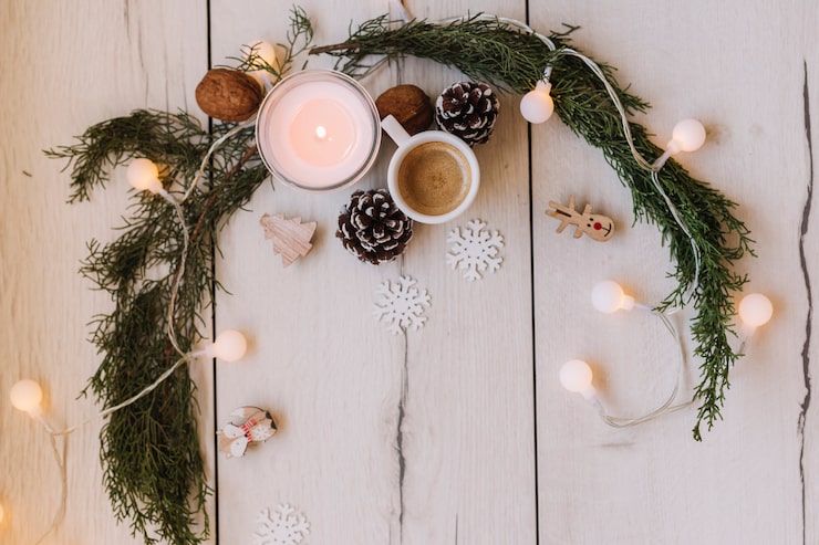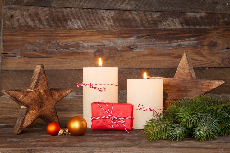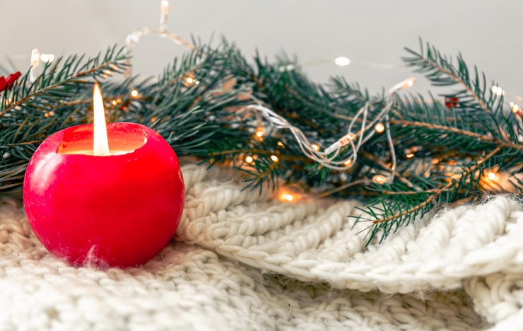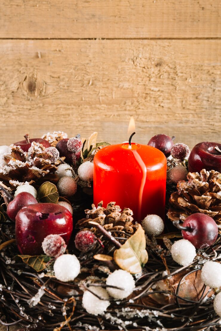 Свечи, еловые ветки и другой праздничный декор