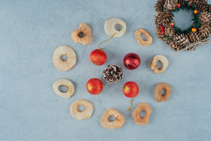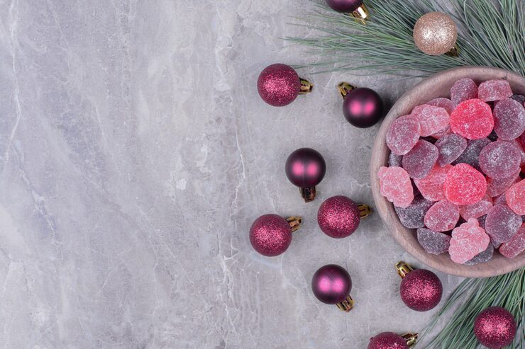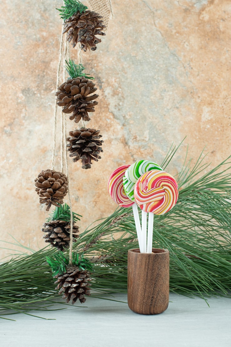 Если вы не собираетесь употреблять рождественско-новогодний венок в пищу, его можно декорировать разноцветными конфетами и покрыть лаком.