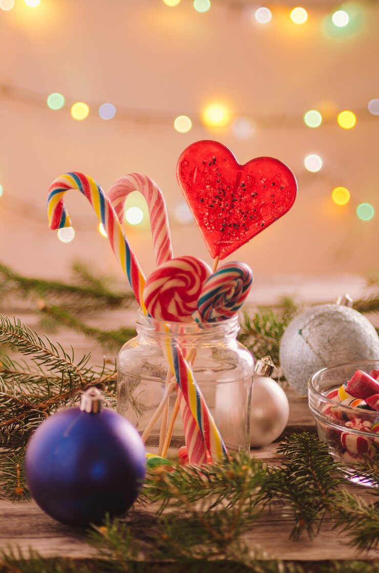 Новогоднюю композицию можно создать, используя сами конфеты. Их можно перевязать флористической лентой и украсить любыми декоративными элементами по вашему вкусу.