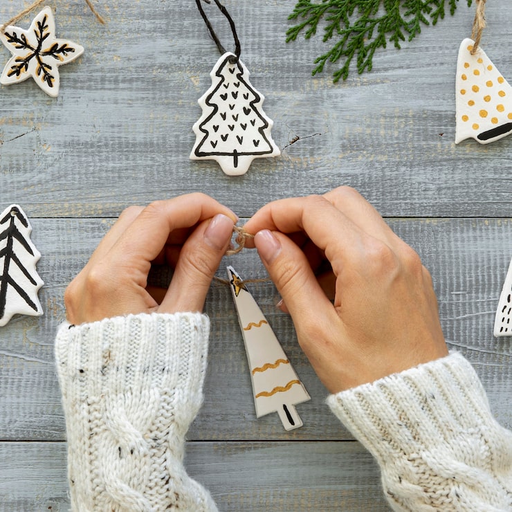 Для создания поделки можно использовать деревянные бусины, нанизывая их на основу, выполненную в форме елки.