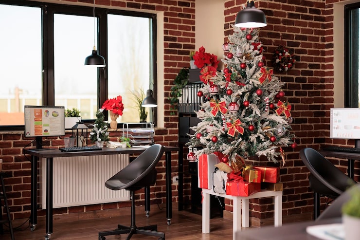 Чтобы в вашем личном кабинете и по всему офису царила атмосфера уюта и спокойствия, используйте природные материалы при создании новогодних композиций. Они наполняют пространство теплом и душевностью, делая офис более комфортным и естественным.