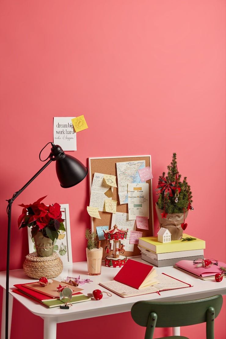 Для оформления офиса используйте канцелярские принадлежности, создавая креативные композиции в деловом ключе. Также можно выделить такими элементами, как часы, пространство рядом с телефоном и принтером, с помощью гирлянд.