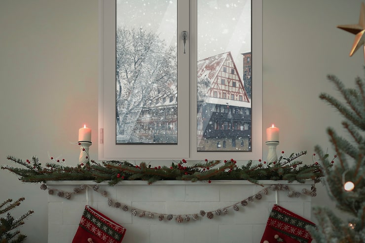 Для украшения подоконника можно использовать еловые ветки, а также расположить на них фетровые игрушки, елочные шары, банты, бусины и свечи.