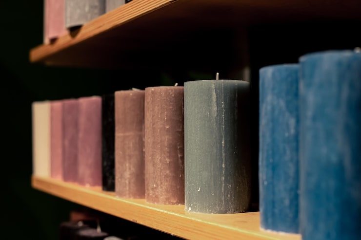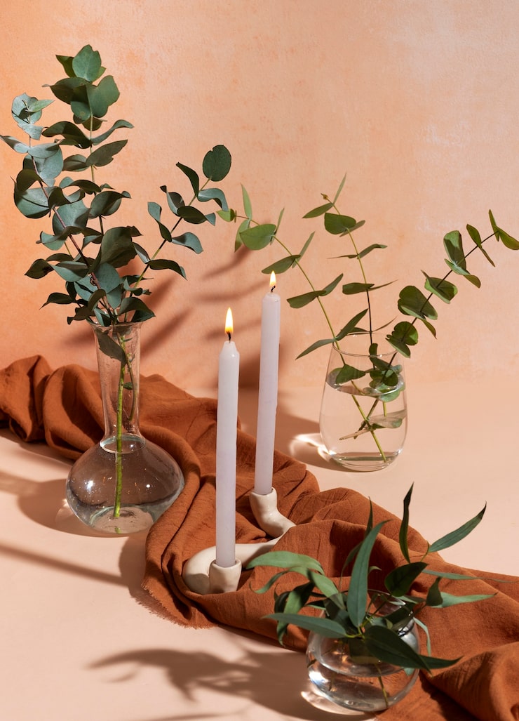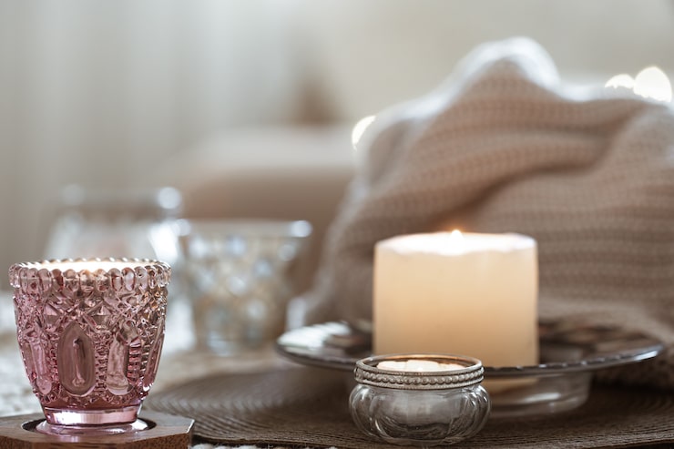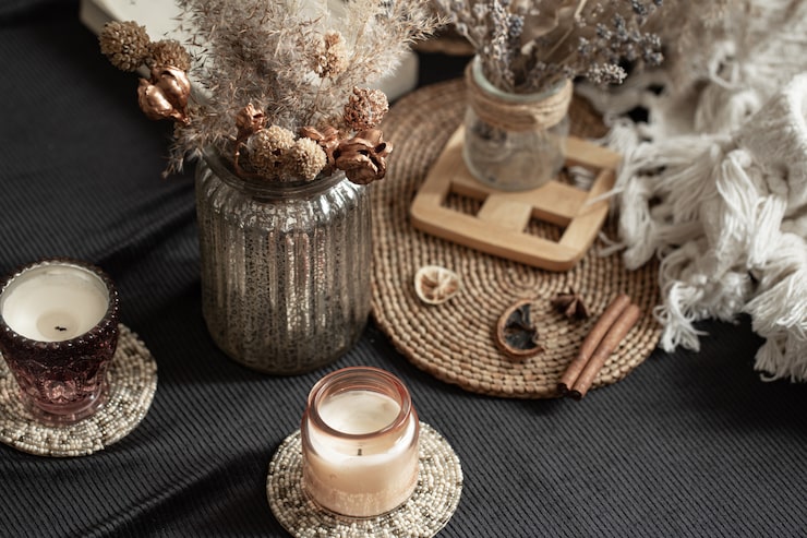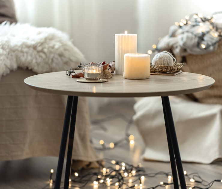 Свечи не всегда требуют декоративной упаковки. На стеклянном журнальном столике можно создать композицию из спила дерева, душистых трав и свечей.
