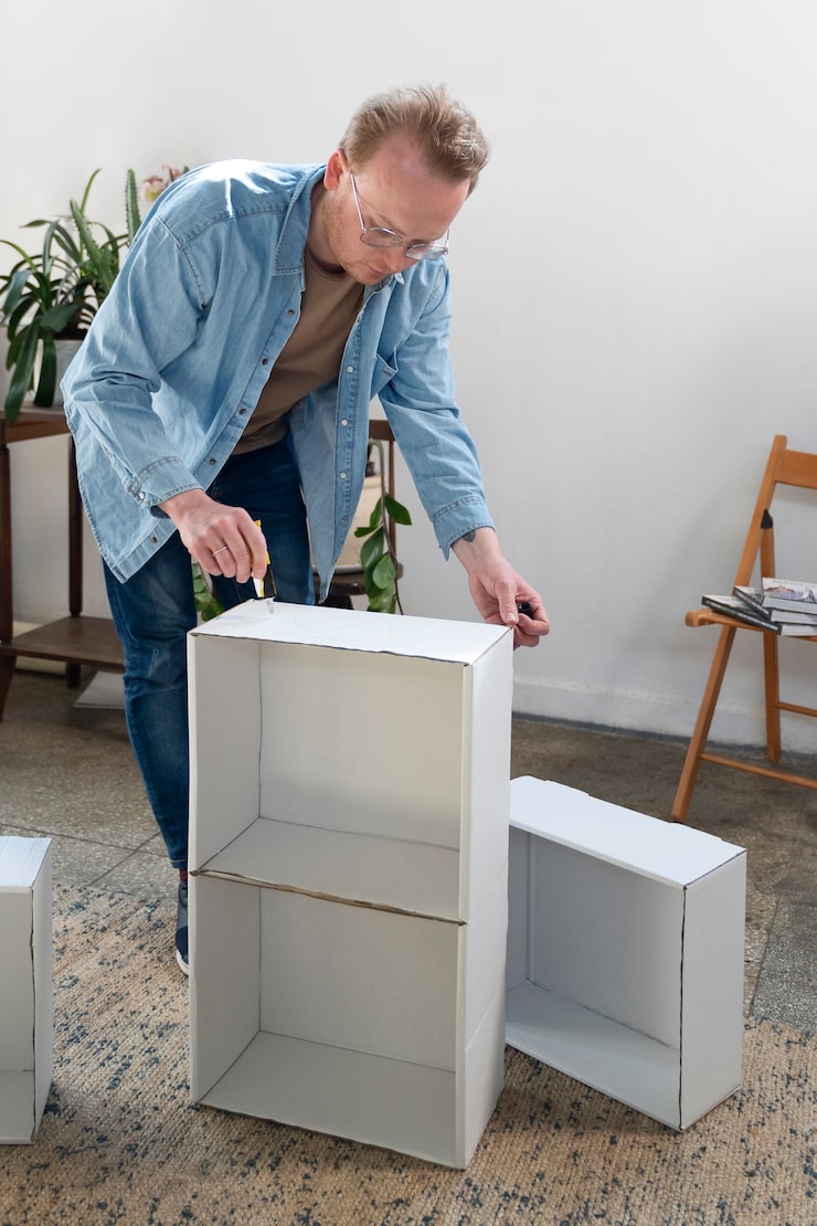 Сначала необходимо соединить все цельные элементы, после чего приклейте детали с одним большим отверстием. Затем приступайте к склеиванию деталей с двумя отверстиями и в завершение приклейте остальные. Для обеспечения надежности конструкции рекомендуется положить что-то тяжелое на органайзер и оставить на ночь. После этого вы сможете разместить стильную и экологичную шкатулку на столе и использовать ее для хранения телефона, блокнотов, записей и других необходимых предметов.