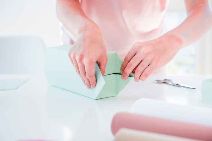 Чтобы подарочные коробки, сделанные на Новый год своими руками, выглядели более аккуратно, рекомендуется заранее провести острым предметом по линии сгиба, обеспечив тем самым ровный и четкий излом картона.
