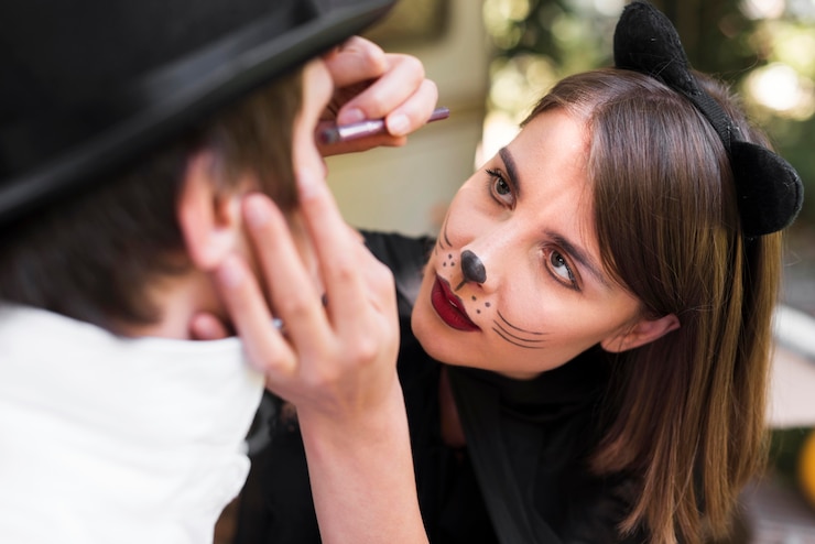 - Нельзя ставить своё здоровье выше праздничной ночи. Категорически не рекомендуется использовать клей ПВА или акварель. Если собственных косметических средств окажется мало, можно купить детский грим.