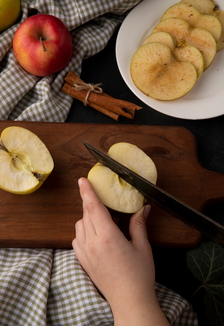 - Яблоки нарезаются на дольки, семена удаляются, а при необходимости снимается кожура.