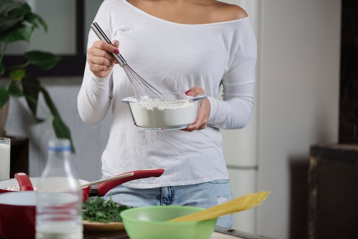 В миске разбиваем яйца, добавляем соль и взбиваем обычным венчиком до получения однородной массы. Муку пересыпаем в отдельную тарелку.