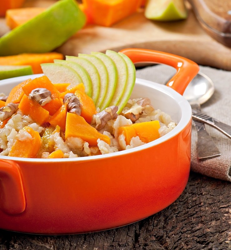 Это блюдо из риса с тыквой и яблоками будет уместно как в постном меню, так и в качестве обычного завтрака или обеда.