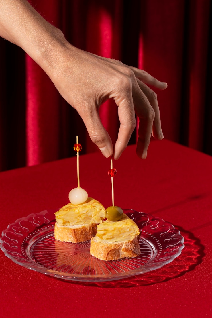 - Выложите на хлеб кусочек бекона, свернутого в рулетик, и добавьте петрушку, затем зафиксируйте конструкцию шпажкой.