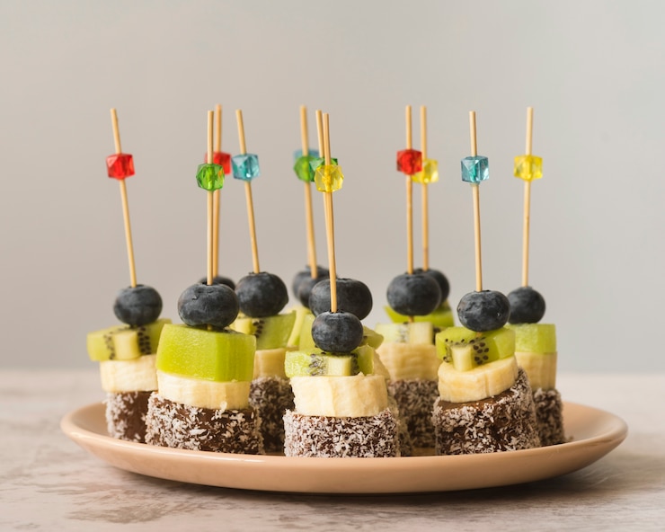 - Киви необходимо очистить и нарезать кружочками. Затем каждый кружок разрезать пополам и наколоть на шпажку.