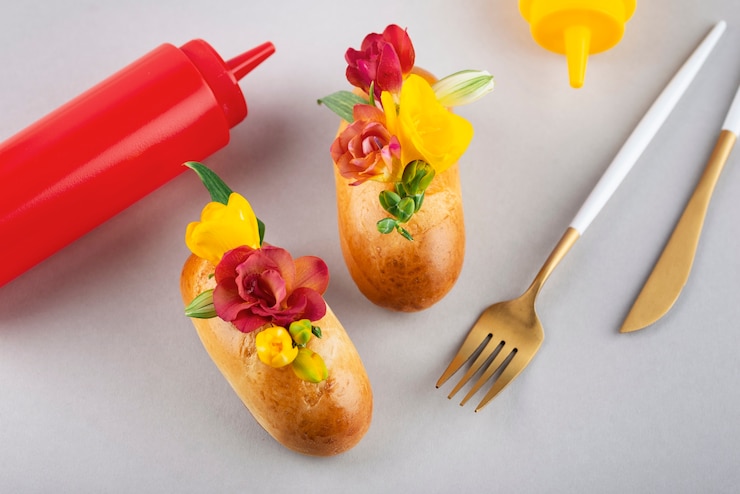 - Намазать хлеб горчицей. В помидор вставить шпажку.