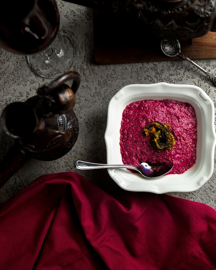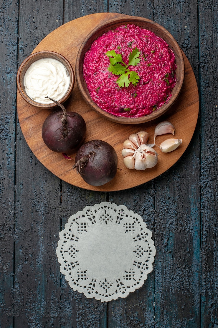 - Свеклу, предварительно отварив, нарезают на небольшие кусочки, затем добавляют майонез и измельчают блендером до состояния пюре.