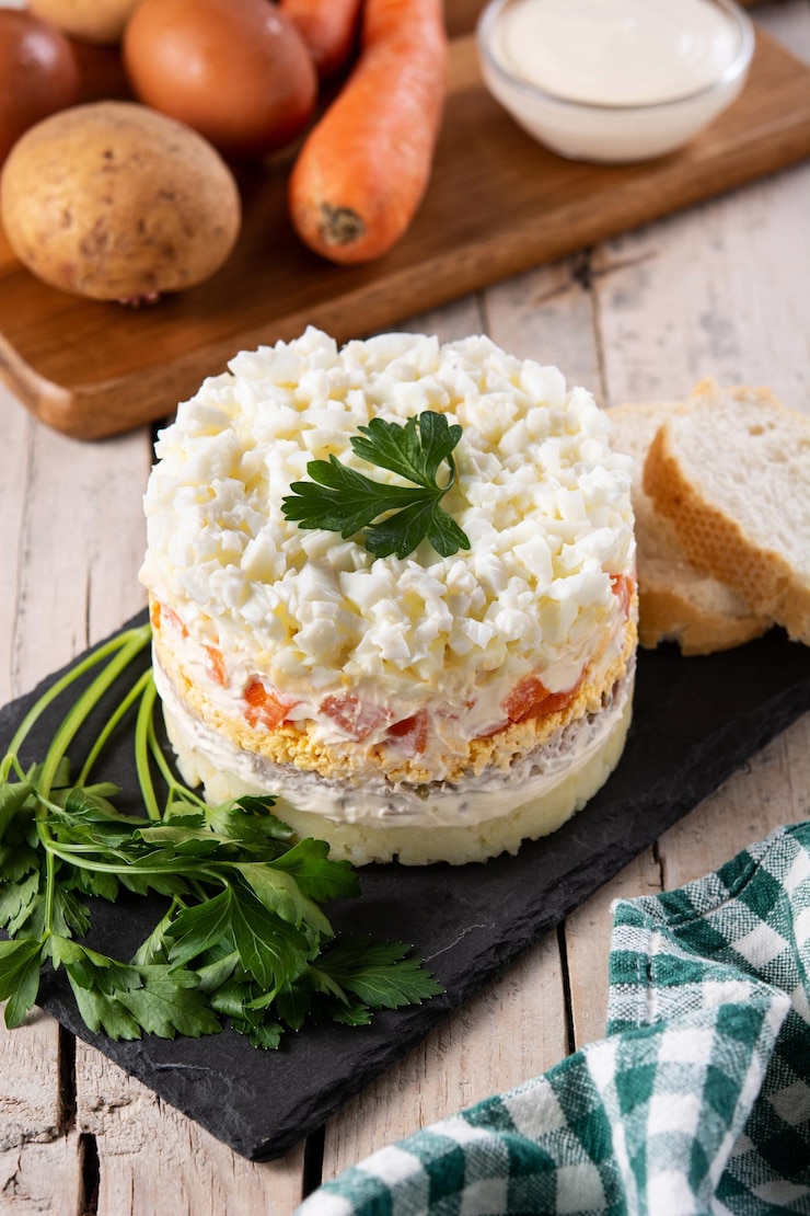 - Наносим на салат тонкий слой майонеза и равномерно посыпаем тертыми яичными белками со всех сторон. Отправляем в холодильник на несколько часов.