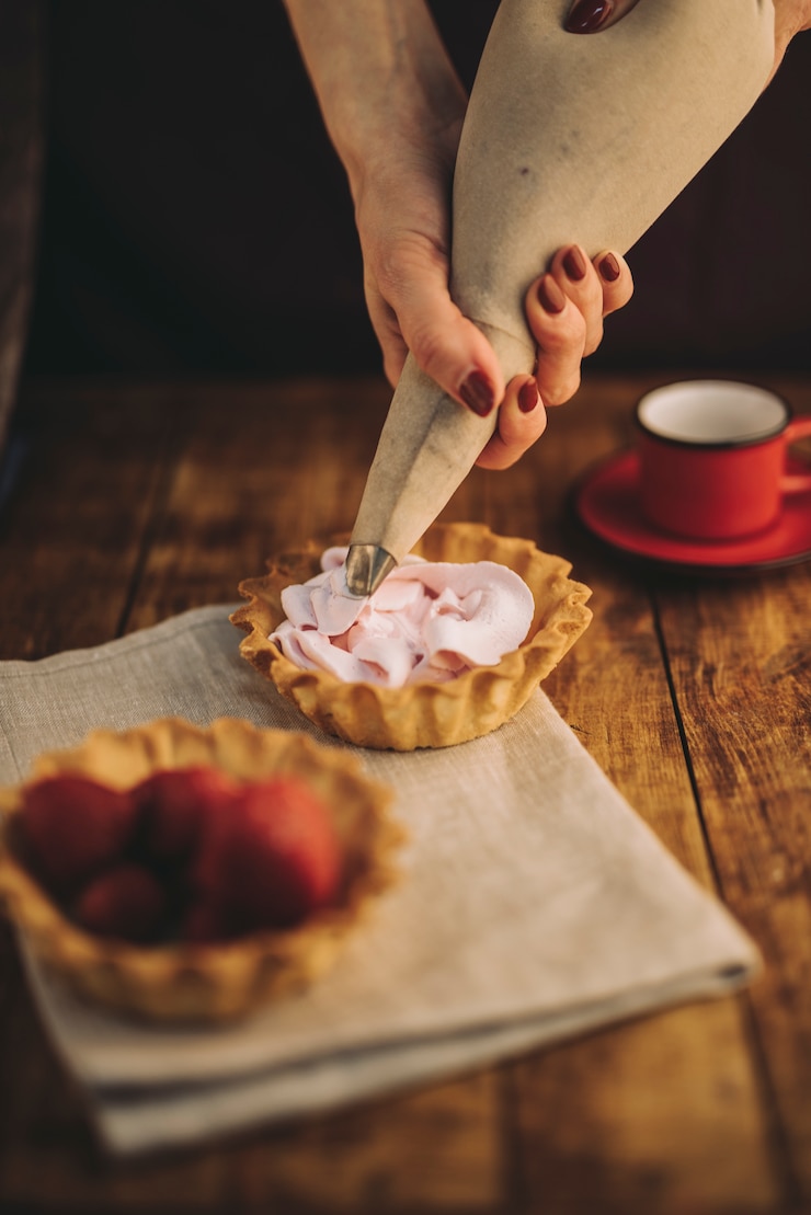 - Добавьте немного красного и желтого красителя, чтобы добиться светлого оранжевого оттенка. Продолжайте взбивать массу. Она должна получиться плотной, тягучей и воздушной. Установите в кондитерский мешок насадку по вашему вкусу. Выложите готовую массу.