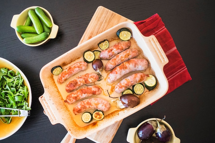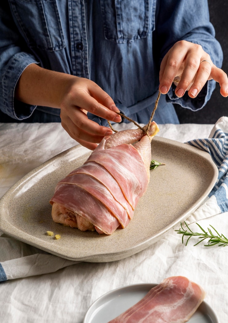 - Сверху мясо накрывают тонкими полосками бекона, затем форму закрывают фольгой, сложенной вдвое, и помещают в духовку, разогретую до 150°С, на два часа.