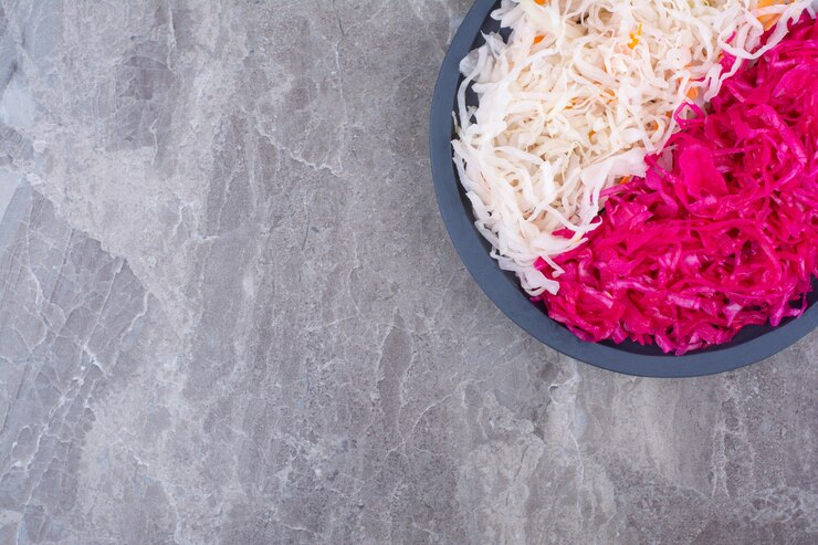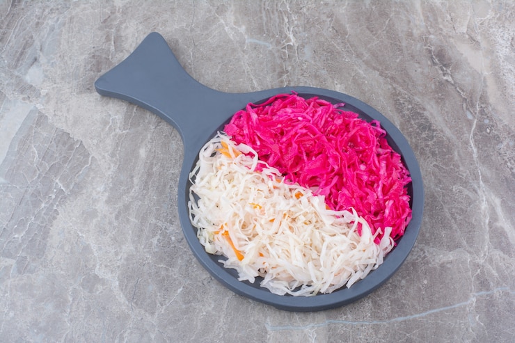 - В глубокую миску выкладываем квашеную капусту и добавляем консервированную фасоль. Если используются свежие бобы, их предварительно замочите в холодной воде, а затем отварите до мягкости.