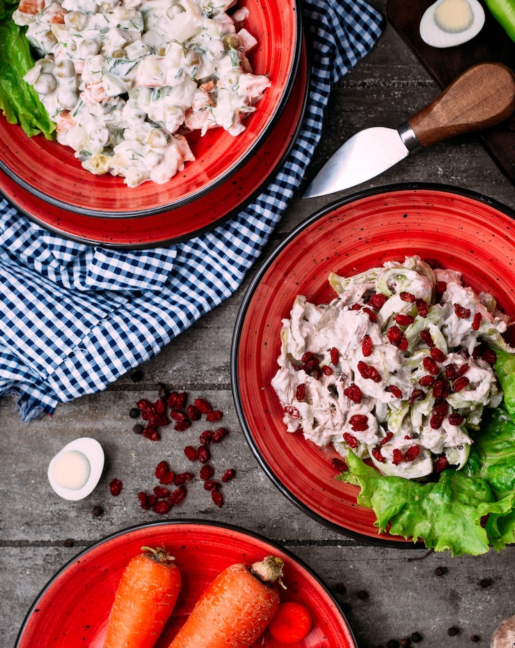 - Соедините подготовленные ингредиенты в глубокой миске или кастрюле из нержавеющей стали, затем добавьте майонез и посолите по вкусу.