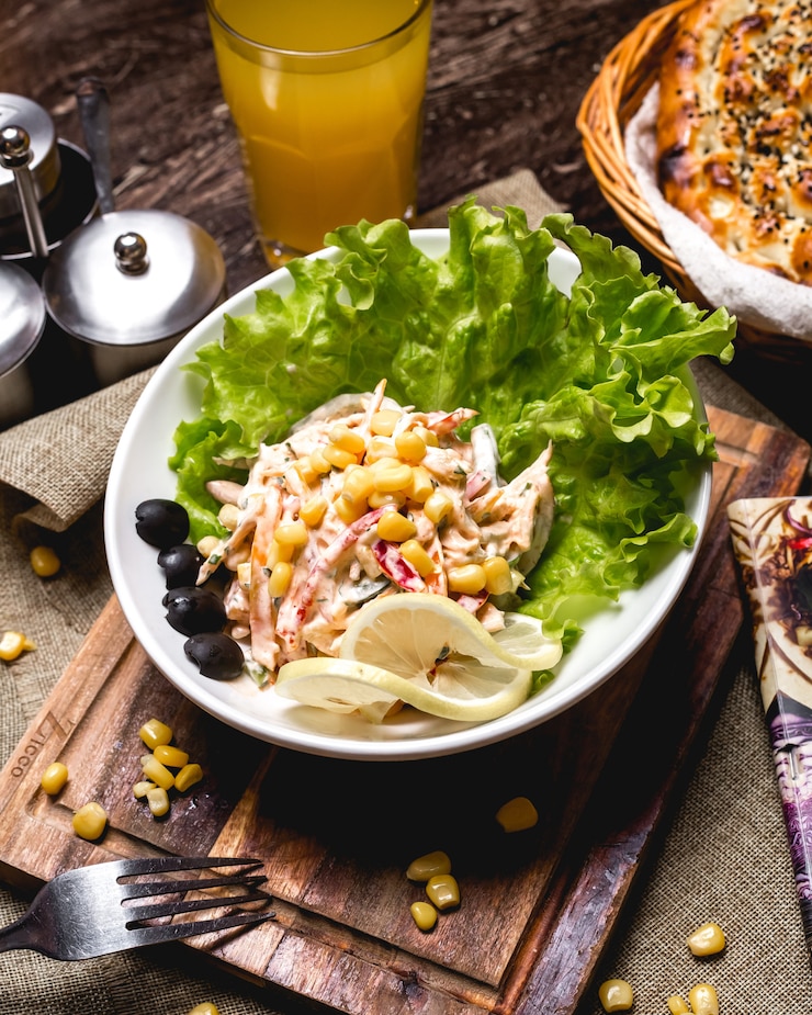 - Промытую и просушенную зелень мелко нарезают и добавляют к остальным ингредиентам. Салат заправляют майонезом по вкусу и выкладывают на тарелку, украшенную листьями салата.