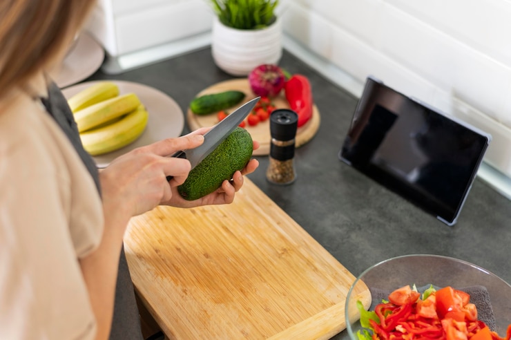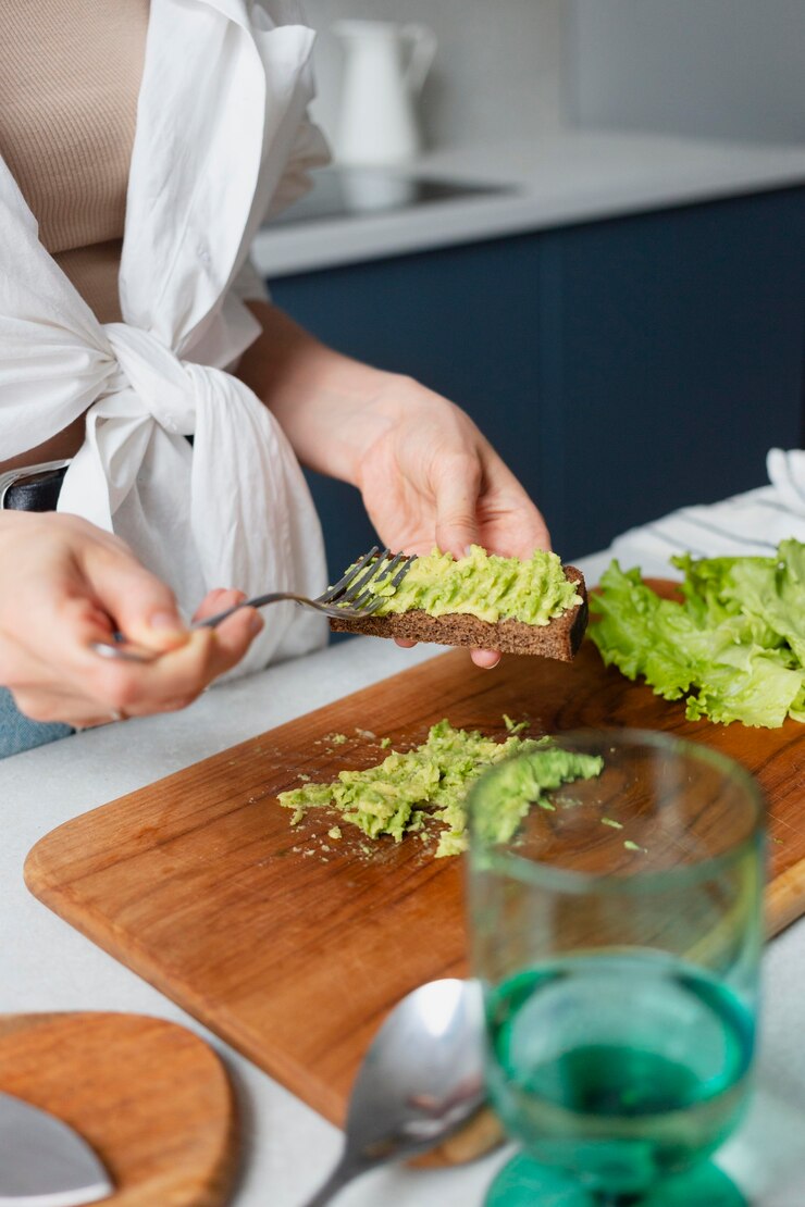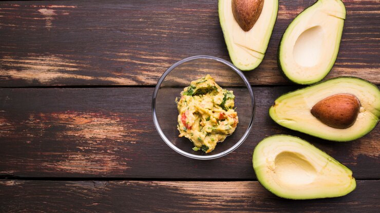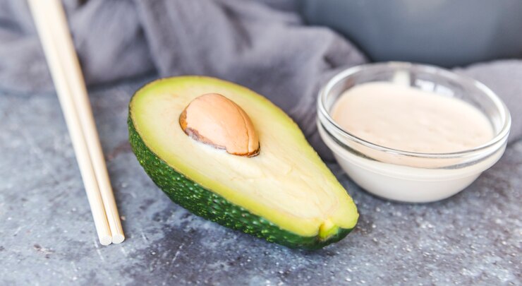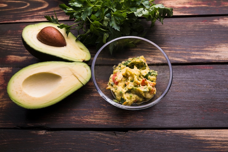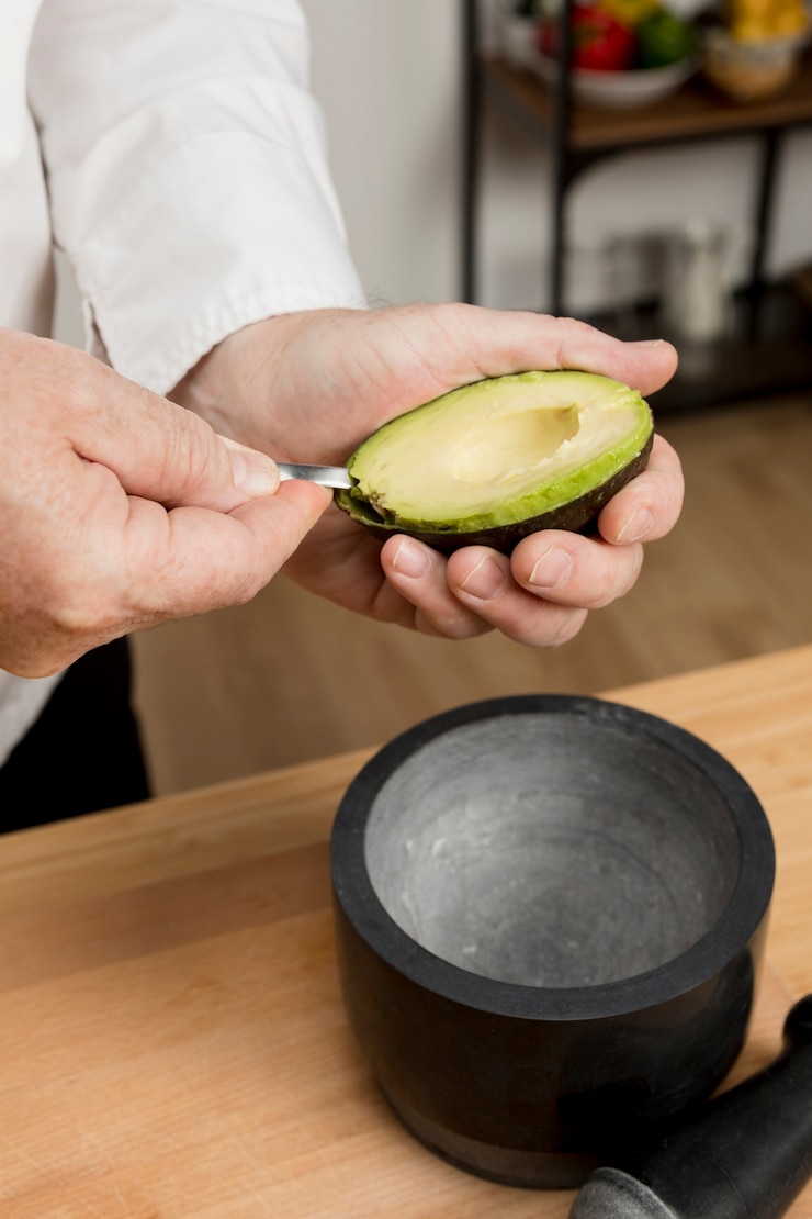 - Авокадо следует разрезать на две половинки и извлечь косточку. Затем ложкой отделите мякоть и поместите её в глубокую чашу, используемую для замеса теста.
