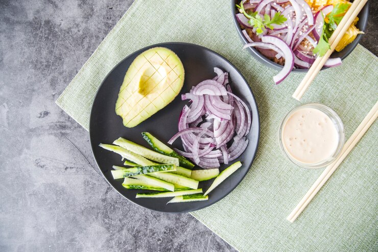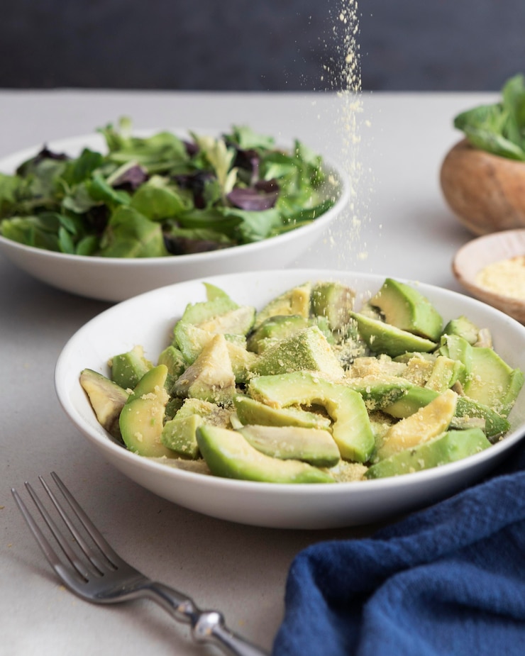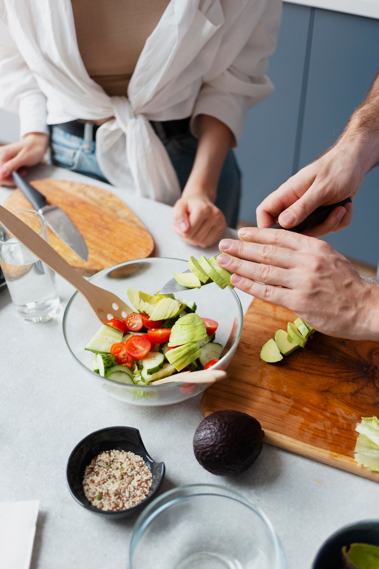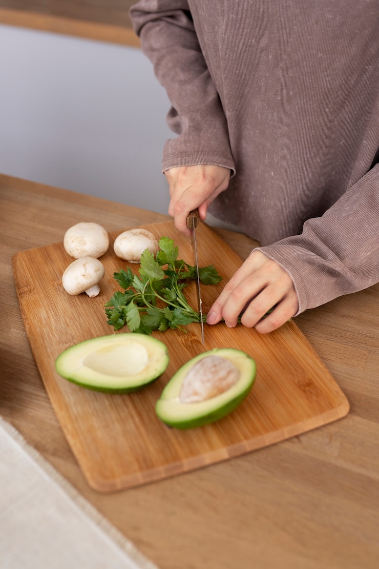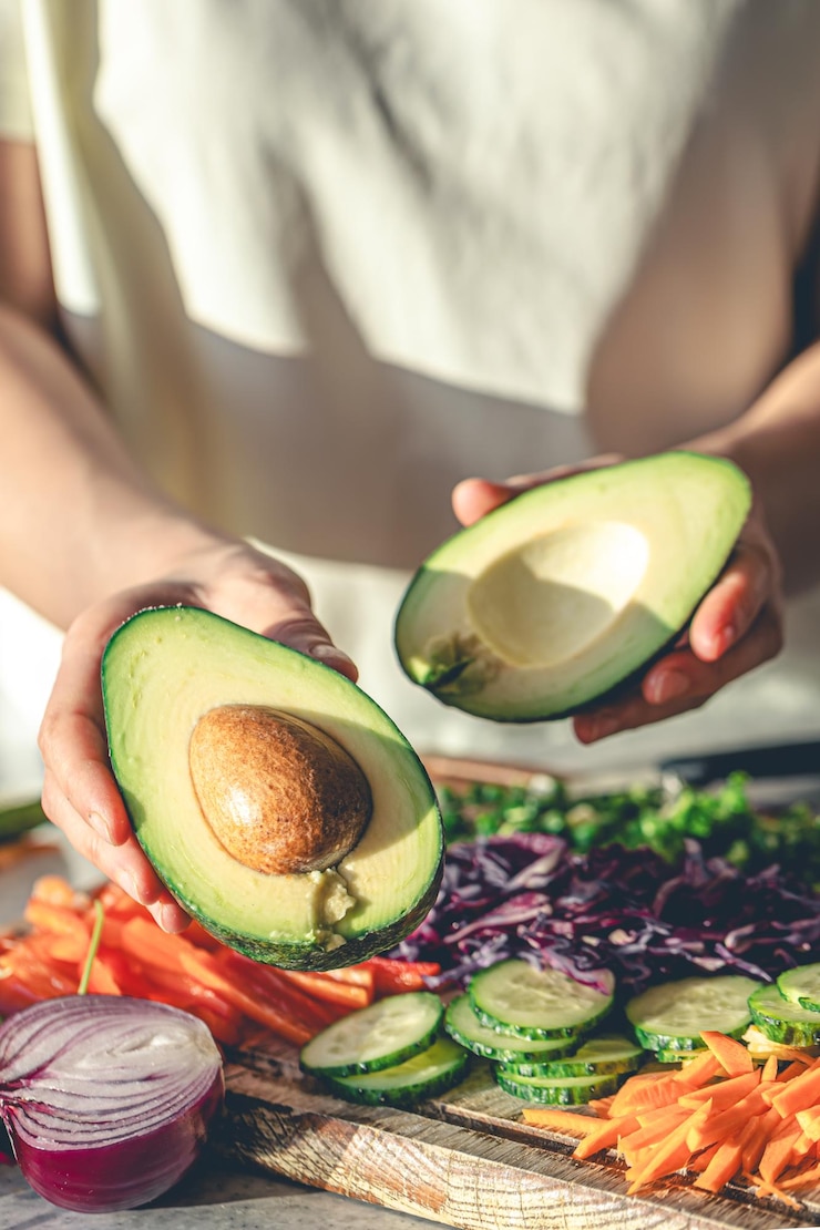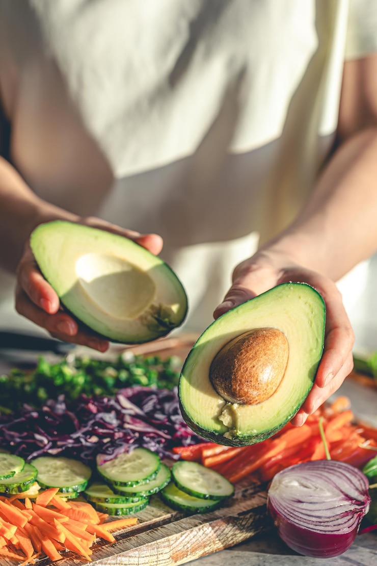 - Авокадо следует разрезать на две одинаковые половины. Косточку нужно удалить, а мякоть извлечь ложкой. Затем нарежьте авокадо так же, как и другие овощи.