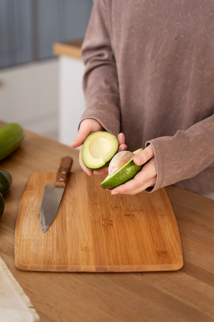 - Авокадо следует разрезать пополам и извлечь косточку.
