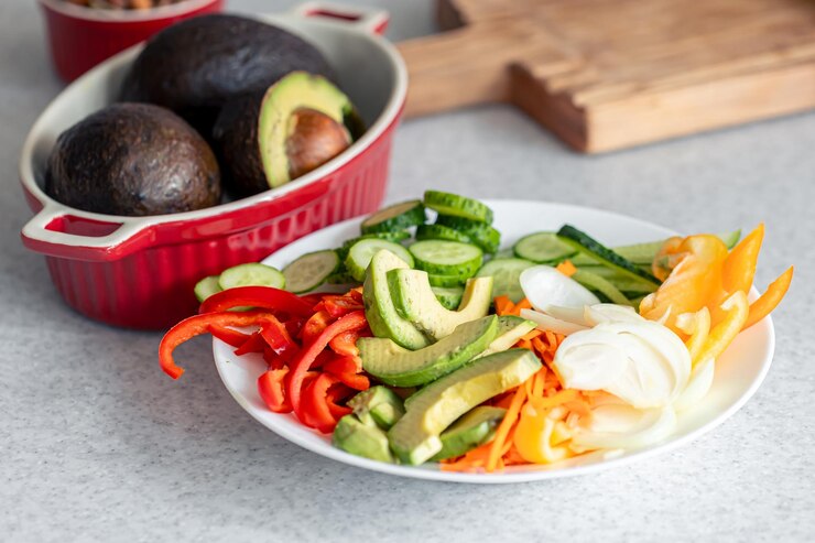 - Авокадо нарезать тонкими полосками. Добавить его в миску с остальными ингредиентами.