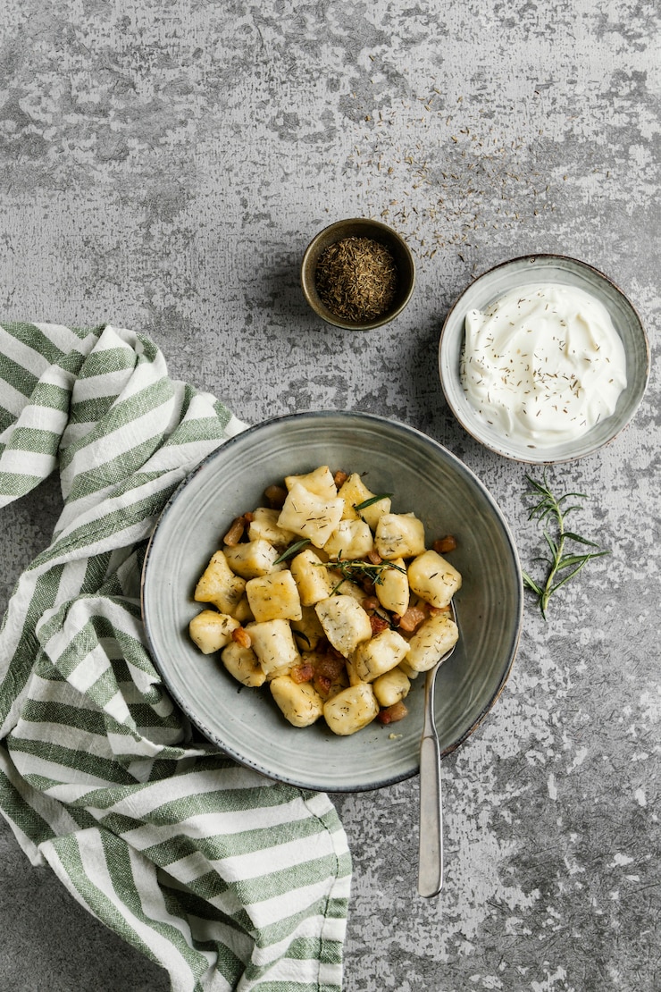 - После пюре добавляем перец, при необходимости солим. Затем небольшими порциями добавляем муку и замешиваем картофельное тесто. Накрываем его пищевой пленкой и оставляем при комнатной температуре на 15 минут.