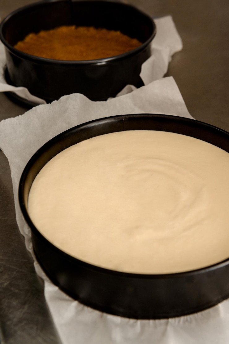 - Пергаментной бумагой выстилаем разъемную форму, затем выливаем тесто и разравниваем его.