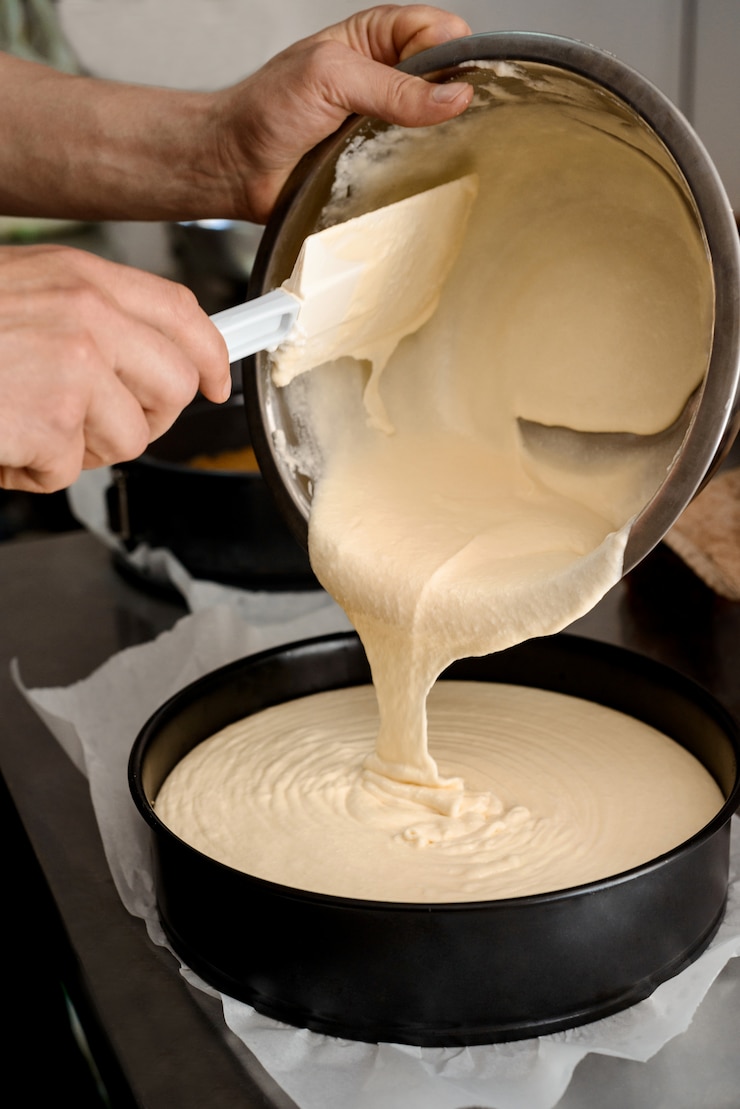 - Извлекаем разъемную форму, выстилаем ее пергаментной бумагой и смазываем маслом. Затем выливаем в нее тесто.
