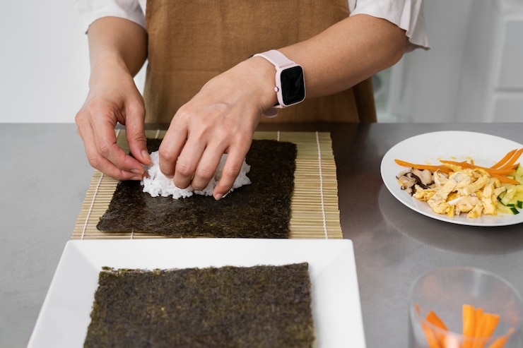 - На циновку выкладывают лист нори, а затем плотно распределяют готовый рис.