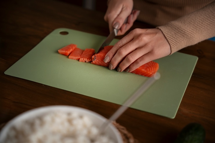 - Лосось необходимо нарезать на небольшие брусочки и расположить рядом.