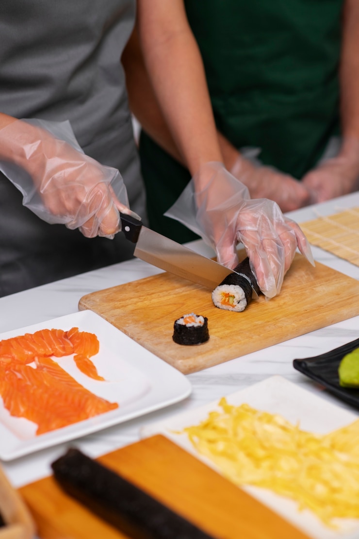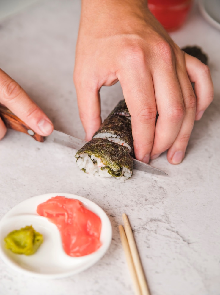 - Заготовку следует разделить на восемь частей. Чтобы обеспечить ровные края квадратов и предотвратить прилипание риса, нож рекомендуется смачивать в прохладной воде.
