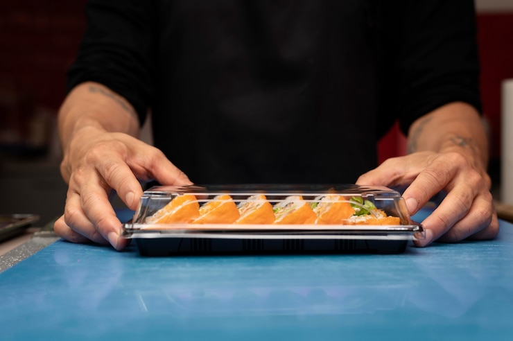 - Для удобства выстилается фольгой противень, на который затем раскладываются роллы.
