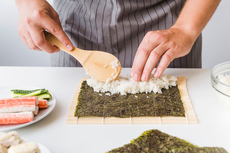 - Рис плотно распределяют на лист нори. Чтобы эта процедура была проще, его желательно немного подогреть, поскольку в таком случае он становится более податливым.