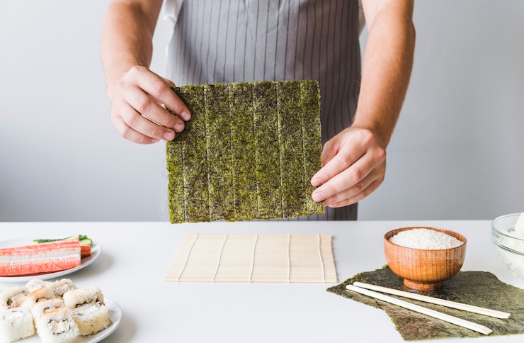 - Необходимо смочить край нори водой и свернуть ролл. Затем подравнять края.