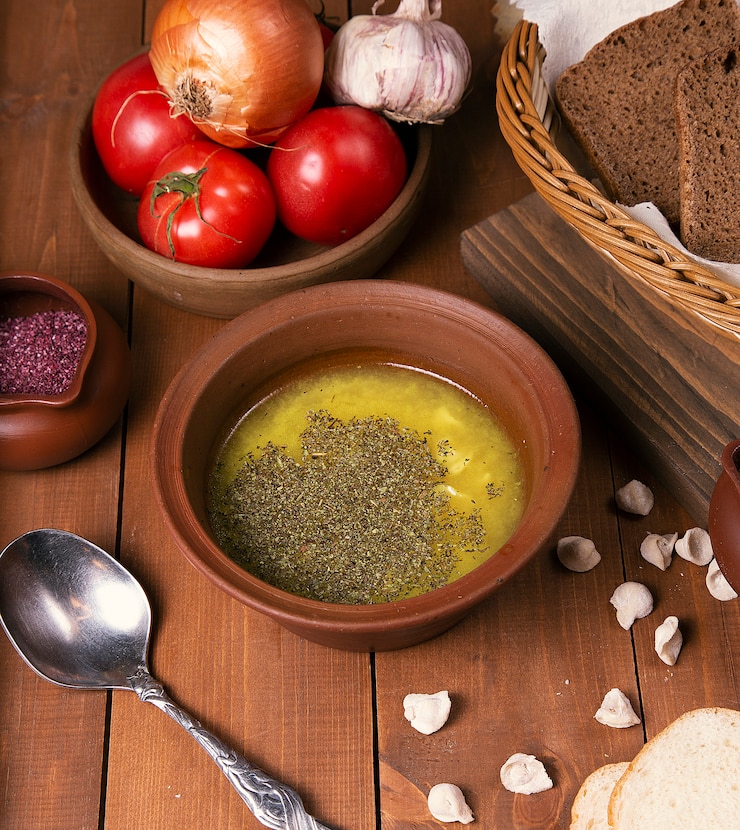 - В чашу блендера выдавливаем чеснок, вливаем немного оливкового масла — много не требуется, потому что помидоры дадут сок. Добавляем сушеные итальянские травы и всё перемешиваем.